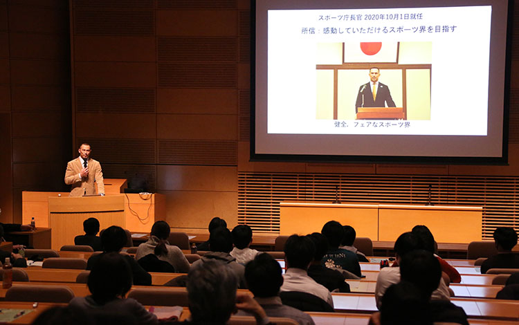 基調講演には、スポーツ庁長官の室伏広治様をお迎えし、「スポーツで未来を創る」のテーマでお話しいただきました。ご講演では、スポーツ庁の「第三期スポーツ振興計画」を通したこれからのスポーツの発展と筑波大学への期待、そして自身のハンマー投げ選手(2004年アテネ五輪金メダリスト)としてのトレーニングにおける身体性とそこに宿る芸術性について論じられました。