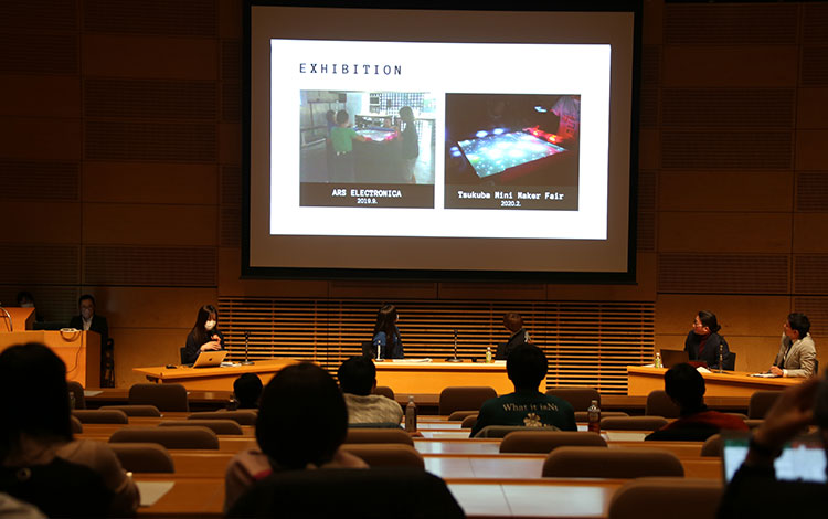 後半には、三木麻衣(体育専門学群・ダンス)と日高衣紅(大学院芸術専攻・版画)、勝部里菜(大学院デザイン学学位プログラム・メディアアート) による対談をおこないました【司会:宮坂慎司(芸術系助教)】。対談では、それぞれの活動と作品が紹介され、ダンス、版画、デジタル・アーツにおける身体性と、体育と芸術の知見と経験が結ばれることで新たなアイデアが創造される可能性が論じられました。