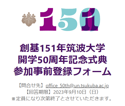 記念式典の事前登録の受付を開始 2023.07.05 創基151年筑波大学開学50周年記念事業として9月30日(土)に行われる記念式典の事前登録が開始されました。 多くの皆様のご参加を心よりお待ち申し上げております。 » 記念式典・記念イベント情報 » 参加事前登録フォーム