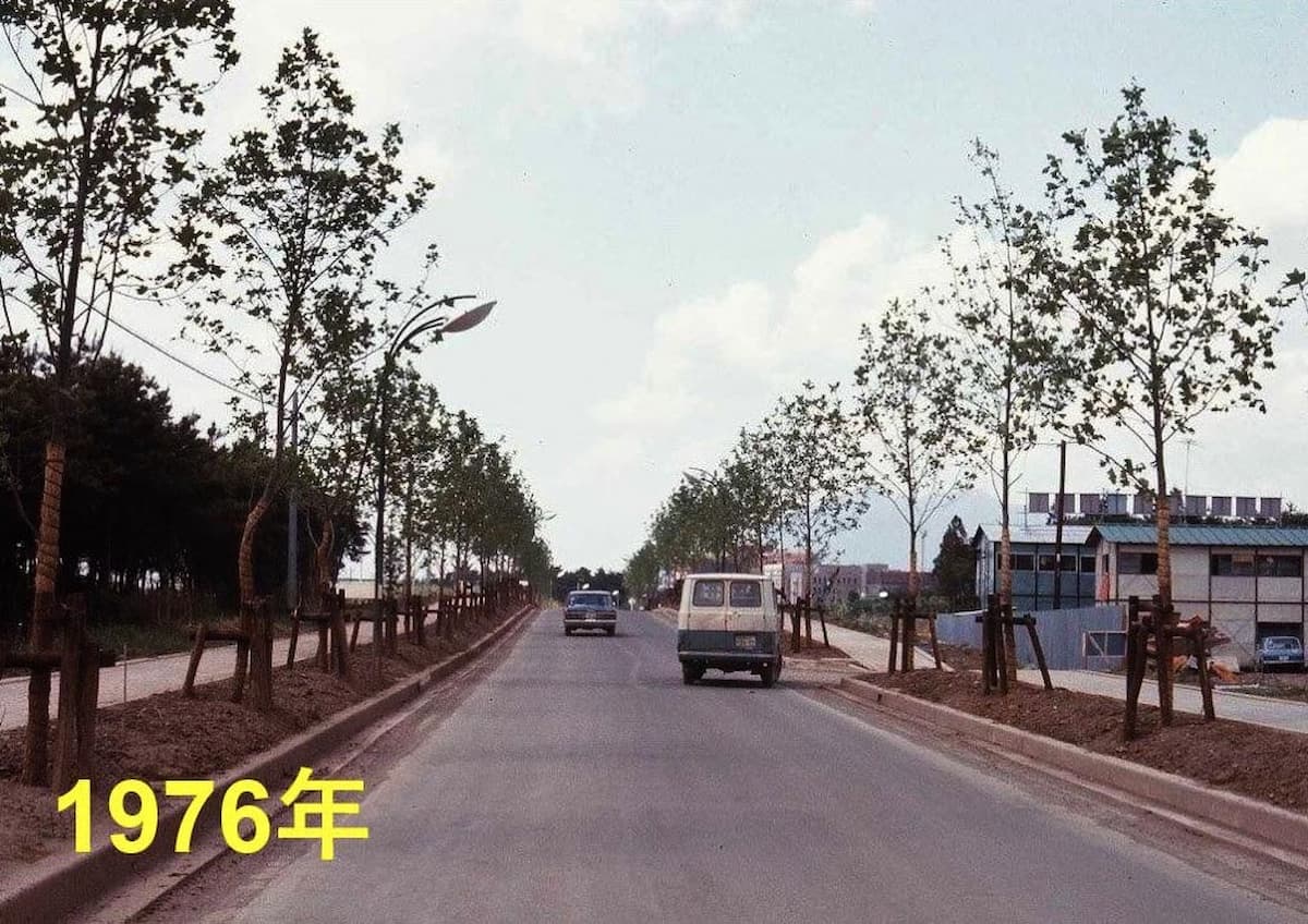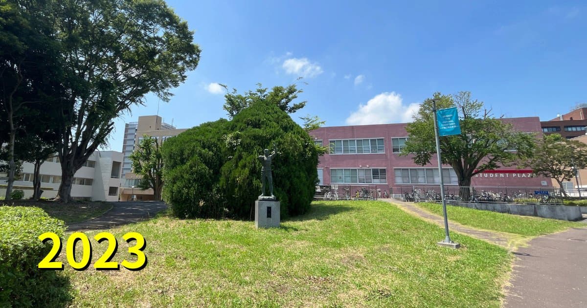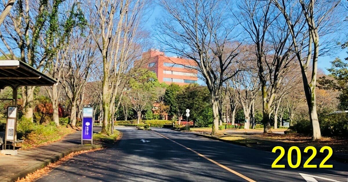 「ループ道路(ゆりのき通り)」が正解でした。平砂学生宿舎西側から北を写したものではないか?など、ピンポイントで当ててくださった方もいらっしゃいました。なんと、当時この写真を撮影した1期生の方からもコメントをいただきました。ヒョロヒョロだったユリノキが、今は見事に成長しましたね。