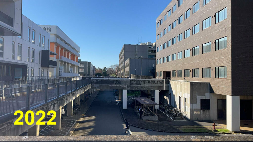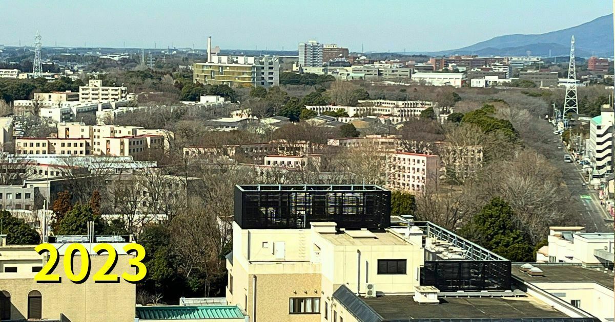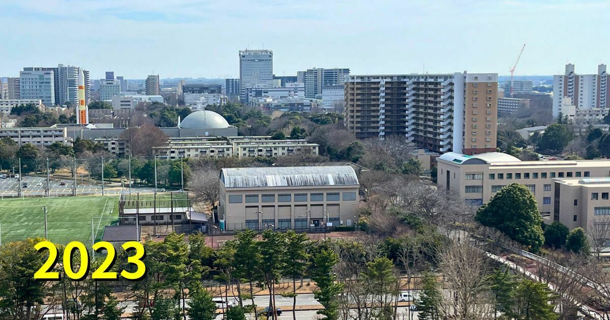 2023年。平砂1号棟が12階建てくらいだったら、こんな風に総合研究棟D越しに5C棟(体芸棟)と筑波山が見えたことでしょう。