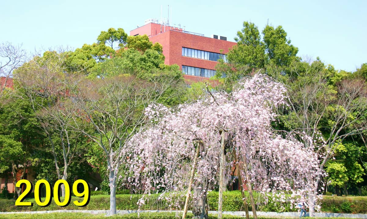 枝垂れ桜は東京文理科大学時代から生きる桜が1975年に移植されて来たたもの。毎年春に目を楽しませてくれた人気の写真撮影スポットだったものの、衰弱し2020年8月に惜しまれつつ姿を消しました。在りし日の姿を写真でご覧ください。