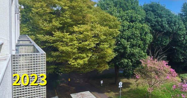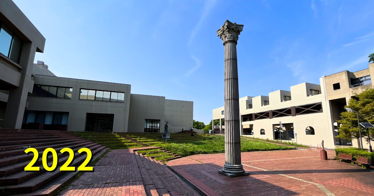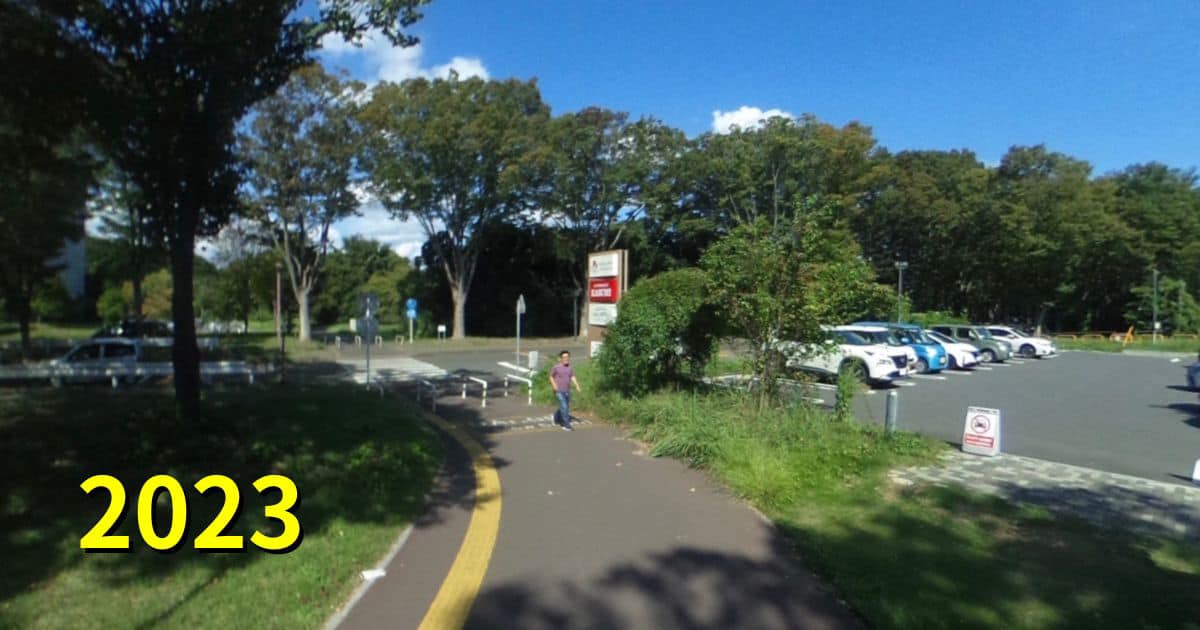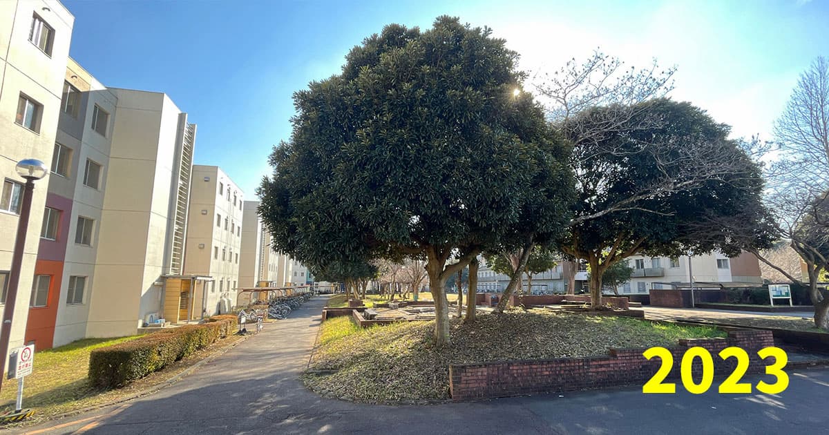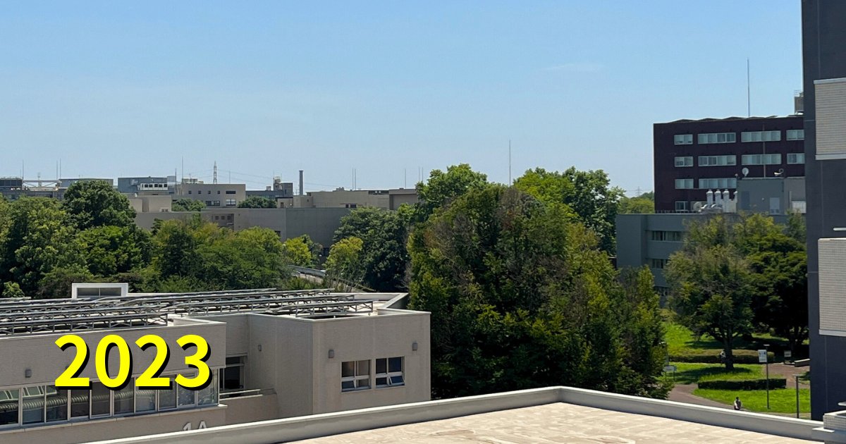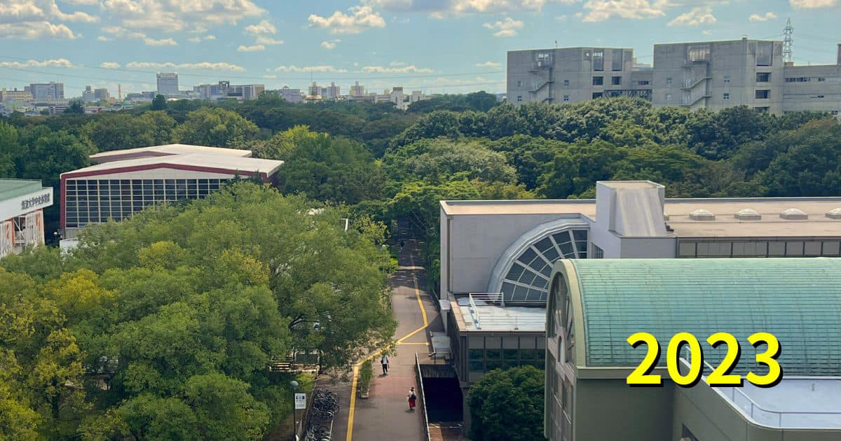 2023年。ペデが整備され、もっと人工物が写るかと思い屋上に登ってみたら、期せずして「大学なのか森なのか」を物語る写真が撮れてしまいました。