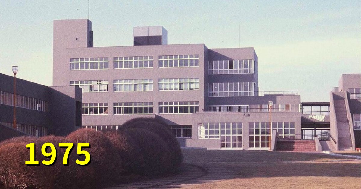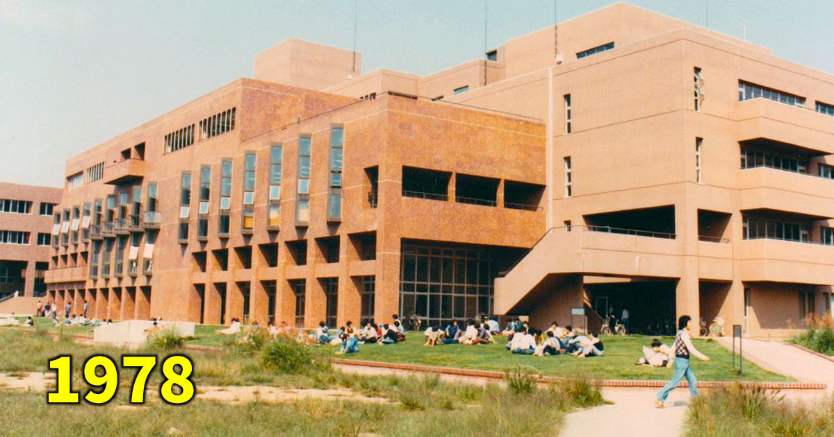 筑波大学は来年、開学50年を迎えます。開学まもない1970年代に撮影されたキャンパス内の写真が出てきました。まだまだキャンパスが建設中だったため、学群を問わず授業はこの校舎で行われていたとか。この建物名は?