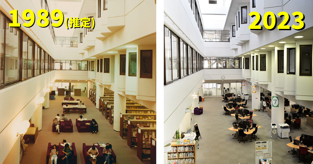 中央図書館といえばこの吹き抜け。4階まで続く開放的な空間が印象的です。雑誌の書架とソファが情報端末に替わったところに時代を感じます。現在ここは「ラーニング・スクエア」と呼ばれ、ライティング支援やプレゼンテーションなどに関する各種セミナーが開かれることも。
