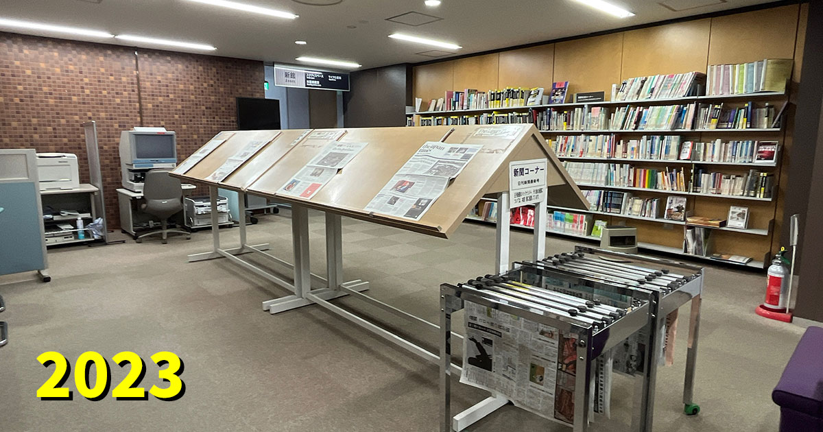 2階エントランスホールの新聞閲覧コーナーを入館ゲート側から撮影したものでした。