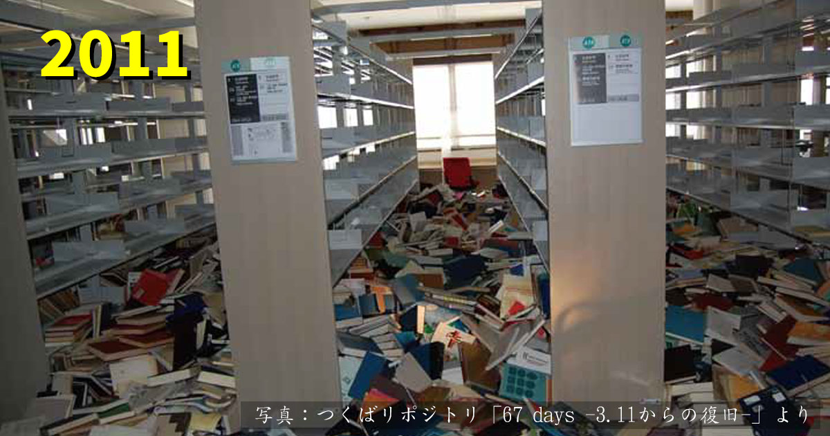 2011年3月11日の東日本大震災発生時には、中央図書館では蔵書の6割にあたる110万冊が書架から落下しました。しかし、大学の「知の拠点」を1日でも早く元に戻そうと、教職員や学生さん延べ539人の復旧ボランティアの皆さんが協力してくださり、約2か月で全サービスを再開することができました。