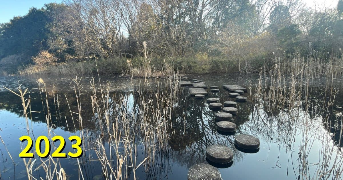 2023年。木々が生い茂り緑一色。目印は土管だけです。