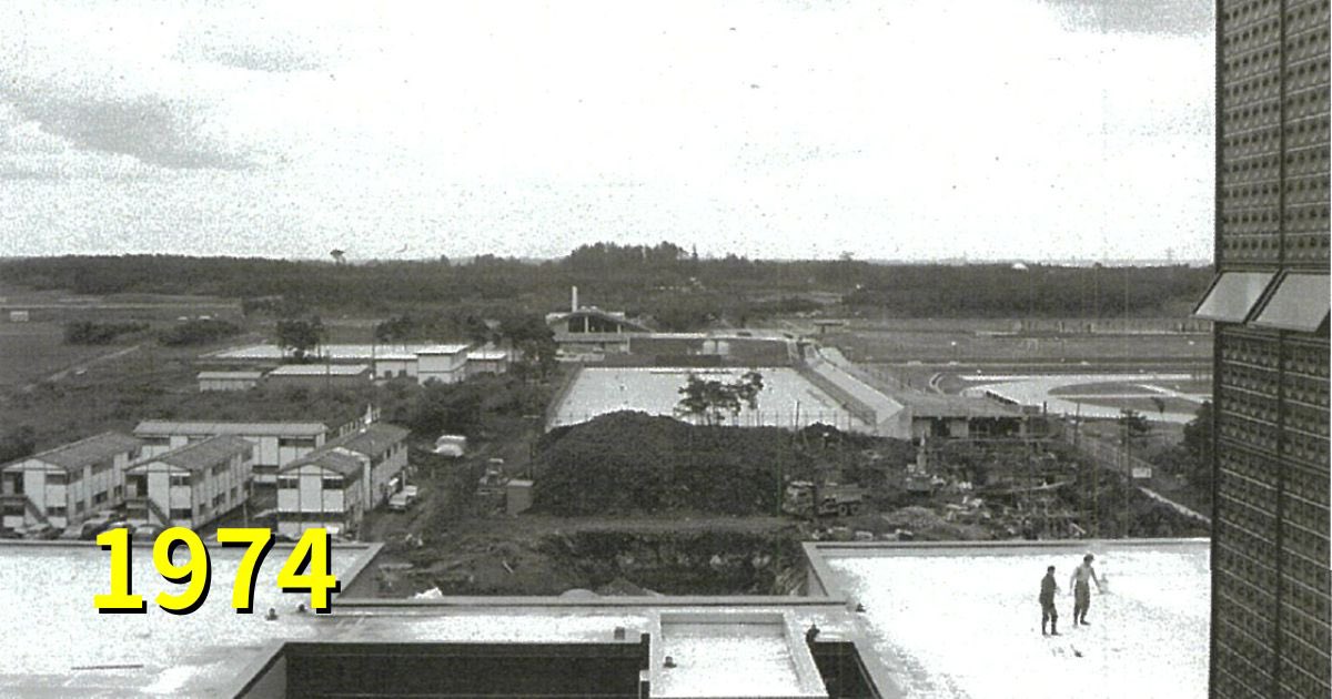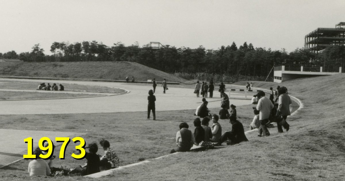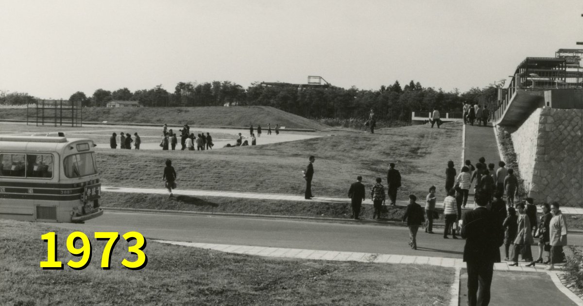 「中央広場」が正解でした。第二・第三エリアの間の池と噴水がある場所です。写真は、石の広場から北向きに撮影したものです。池と噴水は藻の発生を防ぐため最初から計画されていたそうですが、完成は1979年。その直前を捉えた貴重な写真でした。