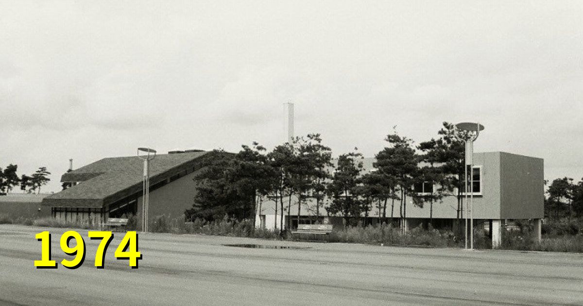 「体育合宿所」が正解でした。第一サッカー場とハンドボール場の間にあり、写真は競技場エリアを東西に貫くペデ上から北向きに撮影したものです。今では目立たないこの建物。開学の年前後に重要な役割を果たしました。