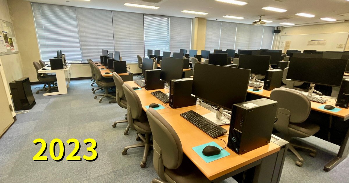 2023年の学術情報メディアセンターの実習室。PCのリプレースが終わったばかりでピカピカです。今では学内16ヶ所にサテライト室(実習室)があります。開学当初の端末の何百万倍の性能を持つスマートフォンを誰もが持ち歩く時代が来るとは誰が想像したでしょう。