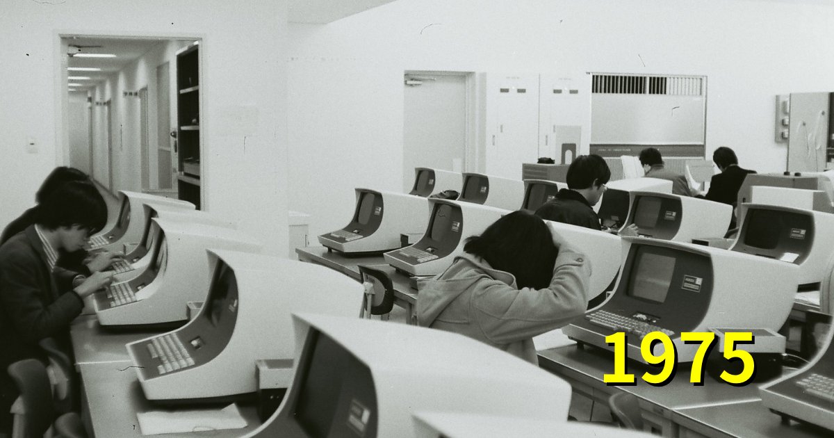 1975年。校舎が体芸棟しか無かった時代。しかし「情報処理」は必修。実習は場所を転々としながら行われていました。当時の開設授業科目一覧によると翌年には実習は1C棟で行われています。この写真はこの年にだけ撮れた貴重な写真と言えます。