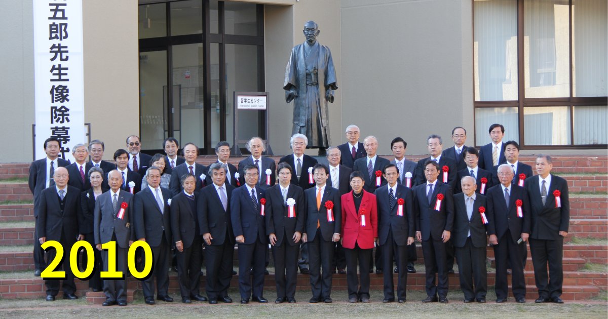 今や入学式や卒業式の人気記念写真撮影スポットなっている嘉納治五郎先生像がこの地に建てられたのは2010年。朝倉文夫氏による威風堂々とした晩年の嘉納先生の像は、ここのほか現存する像は東京キャンパスの占春苑や講道館前など全国5か所にあります。