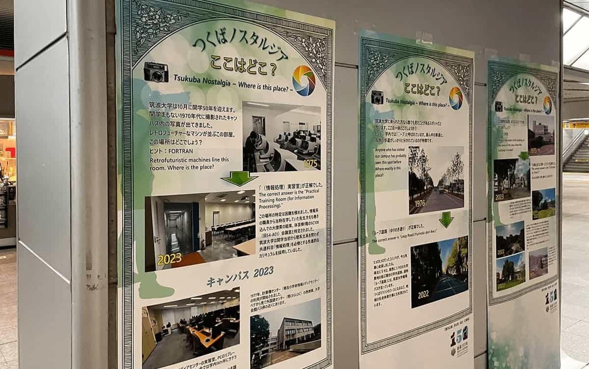 記念式典や記念イベントのお知らせのほか、これまでFacebookやX(旧Twitter)等で展開して来た、筑波大学の過去と現在を比較紹介する企画「つくばノスタルジア」のポスター版も掲示しています。つくば駅をお訪ねの際は是非足を止めてお楽しみください。