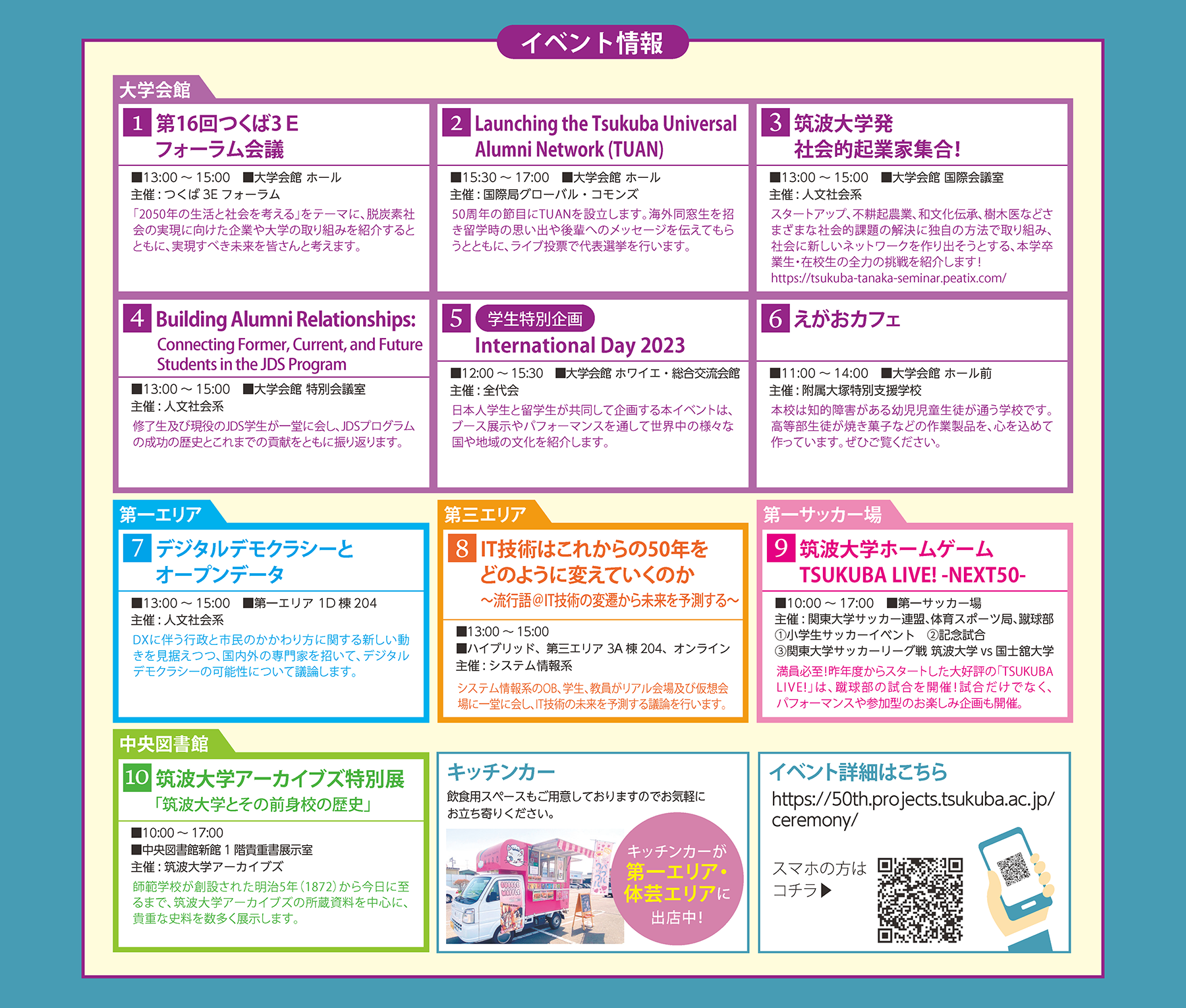 Following the commemorative ceremony at the Tsukuba International Congress Center on the previous day, various commemorative events were held at the Tsukuba Campus, It was an opportunity for current students, alumni, and citizens to get to know each other.