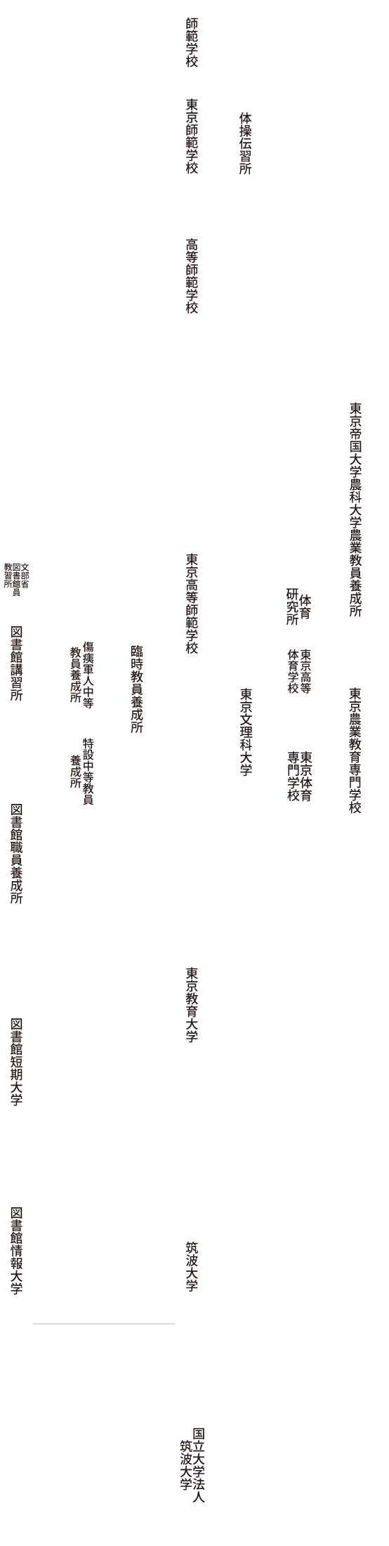筑波大学の起源は1872年、日本初の教員養成機関として発足した「師範学校」にさかのぼります。それから101年、東京教育大学の移転を契機に、よき伝統と特色を生かしながらも、わが国ではじめて抜本的な大学改革を行い、1973(昭和48)年に「開かれた大学」を建学の理念に総合大学として発足しました。開学から40有余年、筑波大学は初心を忘れず、しかもつねに時代を先駆ける大学を目指して不断の改革を続けています。 1872 東京に師範学校設立。 1886 東京師範学校は高等師範学校と改称。 1893 嘉納治五郎、校長に就任。 講道館柔道の創始者。高等師範学校・東京高等師範学校の校長を3期23年余りにわたって務め、教育改革を行いつつ、日本の学校教育の充実、体育・スポーツの発展、そしてオリンピック・ムーブメントの推進に活躍。 1920 東京箱根間往復大学駅伝競走大会優勝 金栗四三が設立した、東京箱根間往復大学駅伝競走大会(現在の箱根駅伝)第1回で東京高等師範学校が初優勝を飾った。 1929 東京文理科大学設置。 1949 国立大学設置法(昭和24年法律第150号)により東京教育大学設置。 1956 朝永振一郎、学長に就任。 東京教育大学第2代学長。1965年、ノーベル物理学賞受賞。くりこみ理論の発明により、量子電気学の発展に寄与。1969年、東京教育大学名誉教授。 1973 国立大学設置法の一部を改正する法律(昭和48年法律第103号)により筑波大学を設置。 1992 江崎玲於奈、学長に就任。 筑波大学第5代学長。1973年、ノーベル物理学賞受賞。量子論的トンネル効果の実証など現代のエレクトロニクスの基礎を担う半導体物理学分野の発展に寄与。1998年、筑波大学名誉教授。 2000 白川英樹名誉教授、ノーベル化学賞受賞。 プラスティックは電気を通さないという従来の常識を覆し、高分子科学分野において「導電性ポリマー」を発見。新たな領域の開拓に寄与。2000年、筑波大学名誉教授。 2002 国立学校設置法の一部を改正する法律(平成14年法律第23号)により図書館情報大学と統合。 2004 国立大学法人法(平成15年法律第112号)により国立大学法人筑波大学を設置。 沿革図