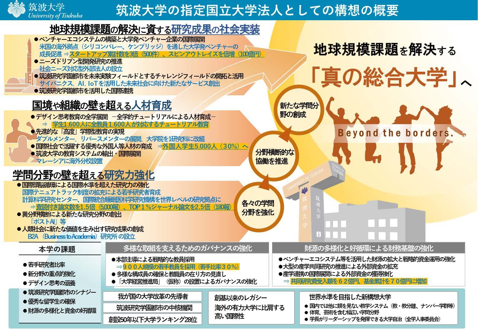 筑波大学は、新たな学問分野を創成することこそが「真の総合大学」と考え、各々の学問分野を強化した上で、学問分野間の壁を超えて分野横断的な協働を推進し、新たな学問分野を創成していきます。独自の出自と歩みを続けてきた筑波大学のみ、これらの壁を超えて、「真の総合大学」へと成長することができます。"Beyond the borders."をスローガンに、指定国立大学法人としてガバナンスと財務基盤を強化し、分野の壁を超えた研究力強化、人材育成、研究成果の社会実装を達成すべく不断の改革を行います。海外の有力大学に比肩する国際性と筑波研究学園都市という立地を活かし、未来社会をデザインできる新たな「知」を創出する世界有数の総合大学として地球規模課題を解決し、持続可能な人類社会の形成に貢献します。