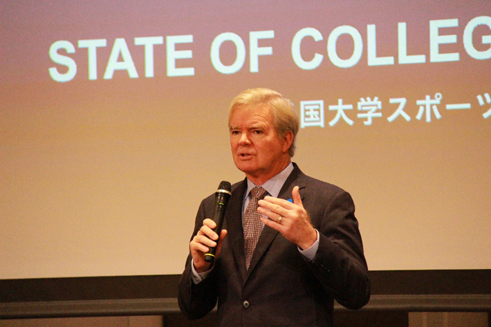 President Mark Emmert of the National Collegiate Athletic Association (NCAA) visited Tokyo on August 30 to attend an event on "State of College Athletics" as a speaker. The event was held as part of a joint project organized by the University of Tsukuba, Dome Corporation, and Temple University. He talked about the NCAA's 100-year history and its transition and reform. He explained that management and leadership skills are important for the development of athletic departments in universities in Japan.