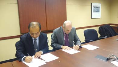 The ceremony for signing MOU at Michigan State University by Prof. Hiroshi Ezura (left) and Dr. Steven D. Hanson (right)