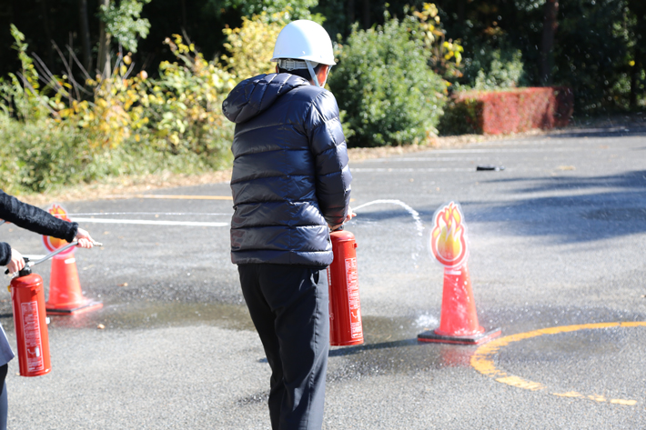 In addition, firefighting training was carried out at the Administration Center. Participants practiced extinguishing a fire using a water extinguisher. They also learned the way to set up hybrid air tents (disaster prevention tent) outside the building.