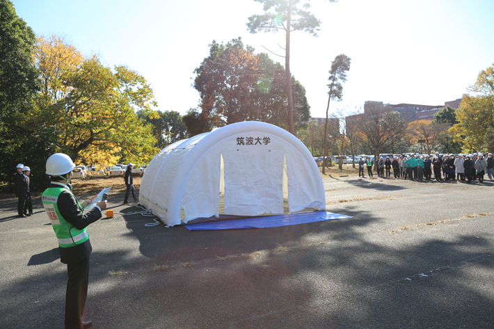 It was held on the assumption that an earthquake intensity 6 lower happened in the city of Tsukuba. Evacuation guidance, transportation of injured people, and safety report to the university's emergency headquarter were included in the drill.