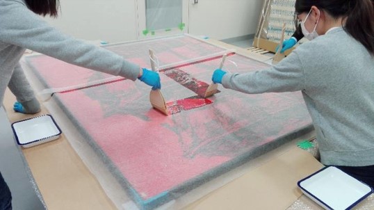 The following procedures were implemented by the laboratory members: removal of mud and dust, omoteuchi procedure (process to protect the surface of the painting) using Japanese paper, and a procedure of hakurakudome (process to prevent the colors coming off). After these steps, the paintings were close-packed in high gas barrier films filled with nitrogen gas. The paintings will be stored in this condition until the next repair procedures.