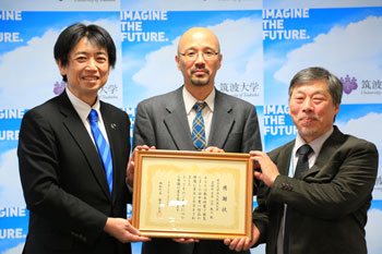From left: Mifune Town Mayor Fujiki, Professor Matsui of the Faculty of Art and Design, Provost Yamanaka of the Faculty of Art and Design