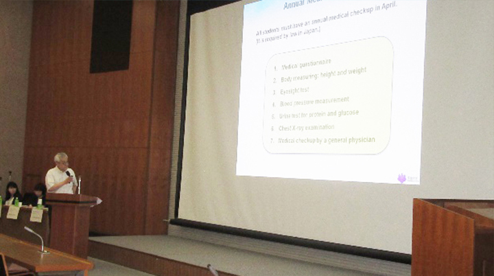 In the second part, Dr. Tohru Sakamoto, Director of the University Health Center of the University of Tsukuba, made an explanation entitled "Campus health, medical and counseling services" regarding medical examination in the university, first aid treatment and others.