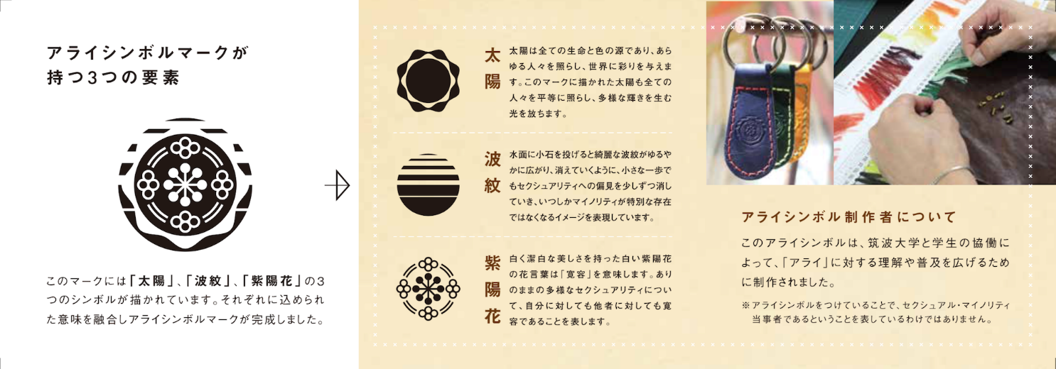 In this context an ally means a person who recognizes the existence of diverse sexualities including not only LGBT but also so-called straight lines and expresses being together, regardless of the parties or non-parties. The mark was created under the collaboration between students and the DAC Center in March 2018 and is used effectively to support the promotion of awareness-rising activity related to LGBT.