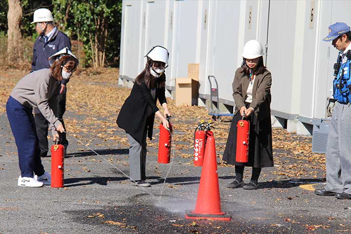 University staff in each department reported on their safety situation to the emergency headquarter during the drill. The emergency headquarter tried to grasp the safety situation as a whole throughout the university, including that of research centers away from Tsukuba Campus. In addition, firefighting training was carried out at the Administration Center. Participants practiced extinguishing a fire using a water extinguisher. They also learned how to set up hybrid air tents (disaster prevention tents) outside the building. After the drill Vice President for General Affairs and Human Resource Development Toshiyuki Inagaki and an officer of the Tsukuba City Fire Department Sakura Division gave comments.