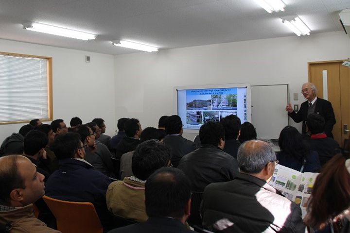 First, the delegation that consists of younger faculty members at Indian Institutes of Technology (15 institutes) and Indian Institutes of Science Education and Research (5 institutes), and junior officers at the Ministry of Human Resource Development and the Ministry of Science and Technology in India heard a lecture delivered by Professor Yoshiyuki Sankai, Executive Research Director at the Center for Cybernics Research; subsequently, moved to the Core Laboratory for Algae Biomass and Energy System R&D Center (ABES), then listened to a lecture delivered by Professor Makoto M. Watanabe, Director of the Center.