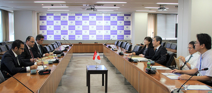 H.E. Mr. Slim Khalbous, Minister of Higher Education and Scientific Research of the Republic of Tunisia, Mr. Shinsuke Shimizu, Ambassador of Japan to Tunisia, and Mr. Mohamed Toukabr, First Secretary of the Embassy of Tunisia in Japan, made a courtesy visit to Vice President Hideo KIGOSHI (Research), Dr. Hiroko ISODA, Director of the Alliance for Research on the Mediterranean and North Africa (Professor of the Faculty of Life and Environmental Sciences), and Specially Appointed Professor Mitsutoshi NAKAJIMA on August 30, 2019.