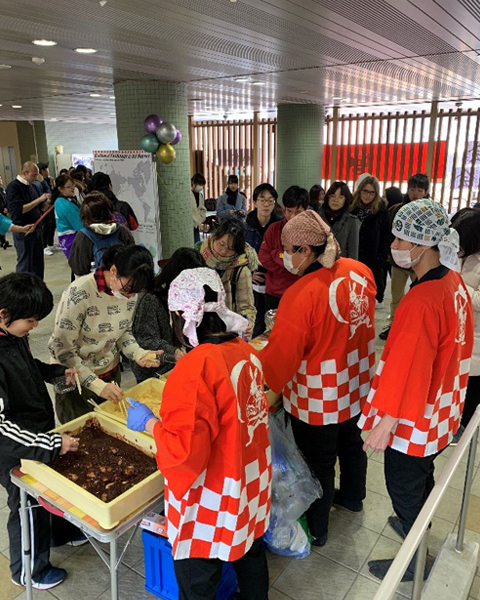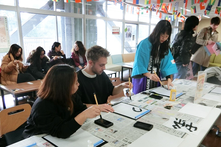 The "Mochi-Tsuki & Japanese Calligraphy Ceremony" was held at Student Commons of the university on January 24. This is conducted to deepen mutual exchange through the introduction of Japanese culture covers all faculty members, employees, and students with a focus on international faculty members and employees of the university and their families under the auspices of the International Support Office and Campus Globalization Division of Global Commons. This year, under the cooperation of students who conduct international exchange activities on a regular basis and students majoring in calligraphy in the School of Art & Design, there was an extensive presentation of the customs of rice-cake pounding and the first writing of the New Year. On this day, the venue was filled with excitement including a huge line in a quest for freshly-made rice cakes as a large number of international students and Japanese students challenged the traditional rice-cake pounding using a mortar and pestle. Furthermore, participants who finished eating the rice cakes interacted as they put their thoughts down on Japanese writing paper in the Japanese custom of practicing calligraphy at the beginning of the year and took home their creations with a smile. Global Commons is scheduled to regularly hold cross-cultural exchanges like this. Furthermore, we would appreciate your comments or preferences on themes handled at the cross-cultural exchanges.
