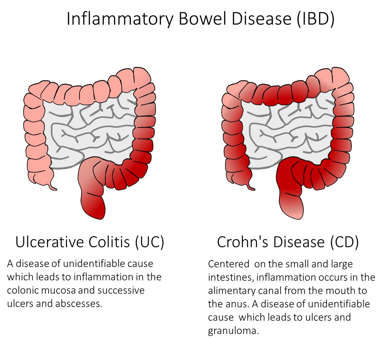 Figure 1) IBD is a group of diseases which cause inflammation and ulcers in the alimentary canal, as well as symptoms such as bleeding, diarrhea, weight loss and fever. Narrowly defined as UC or CD.