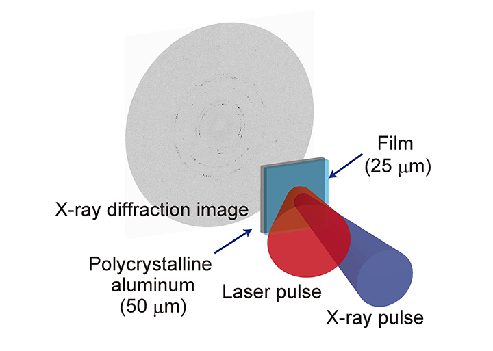 Aluminum foil irradiated by a laser-driven shock wave is followed by an X-ray pulse to read the diffraction pattern of the crystal structure.