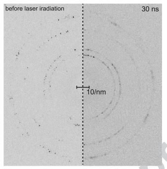 Diffraction images of polycrystalline aluminum foil before laser irradiation (left image) and after shock wave propagation (right image). The laser-induced shock wave pattern issmoothed due to plastic deformation.