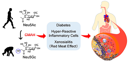 A research group of Dr. Kunio Kawanishi, Assistant Professor at Faculty of Medicine, University of Tsukuba, in the research conducted at the Glycobiology Research and Training Center (Department of Cellular and Molecular Medicine, University of California, San Diego, UCSD), found that an evolutionary loss of gene 'CMAH' may have resulted in a heightened risk of cardiovascular disease in humans.