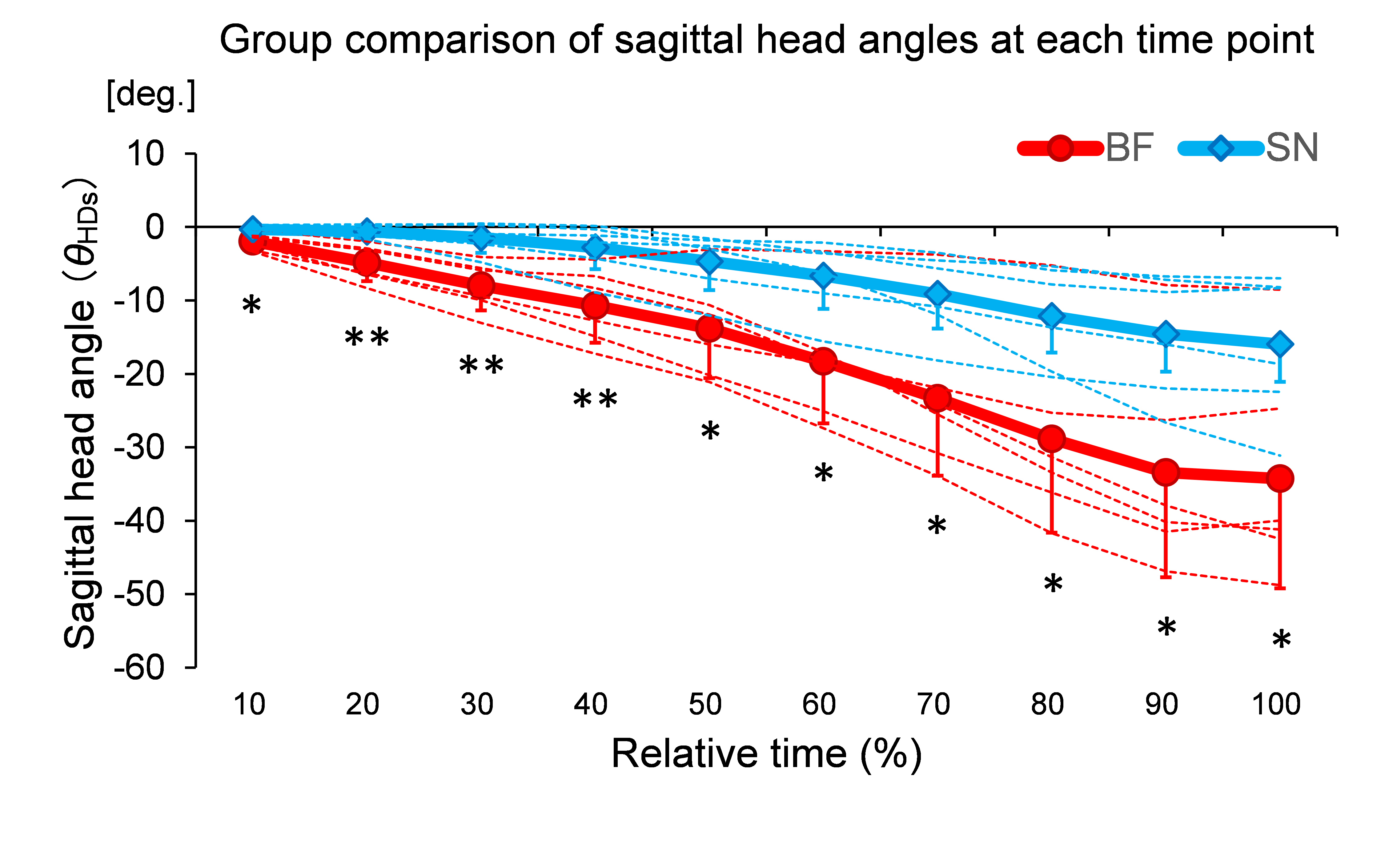 Fig. 3 The relative angles of the head rotations in the sagittal plane (θHDs) at each time point were significantly larger in the blind footballers (BF) than those in the sighted non-athletes (SN) at all time points. These results indicated that more downward head rotations were consistently observed in the blind footballers.