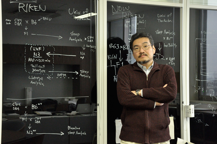 Prof. Yanagisawa began to pursue sleep research after his discovery of a neurotransmitter called orexin. At that time, absolutely nothing was known about the function of orexin. Eventually, it was discovered that mice that cannot produce orexin develop a sleep disorder called narcolepsy, which showed that the ability to switch between sleeping and waking can be disrupted by an abnormality in a single gene. This was a major advance in sleep science.