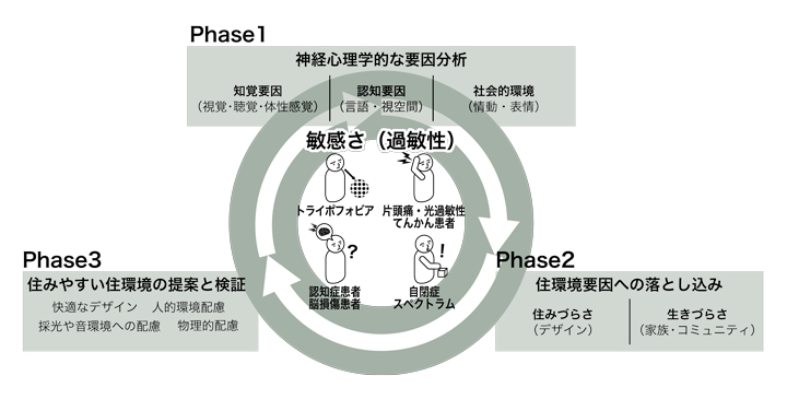 Phase 1: Identify factors that cause various kinds of sensitivity and uncover the mechanisms of how the brain responds to sensitivity by studying young subjects as well as patients with dementia and brain injuries.