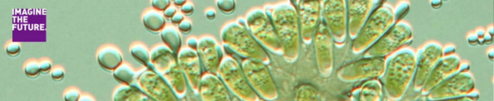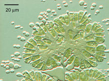 (Right photo) Microscopic image of Botryococcus