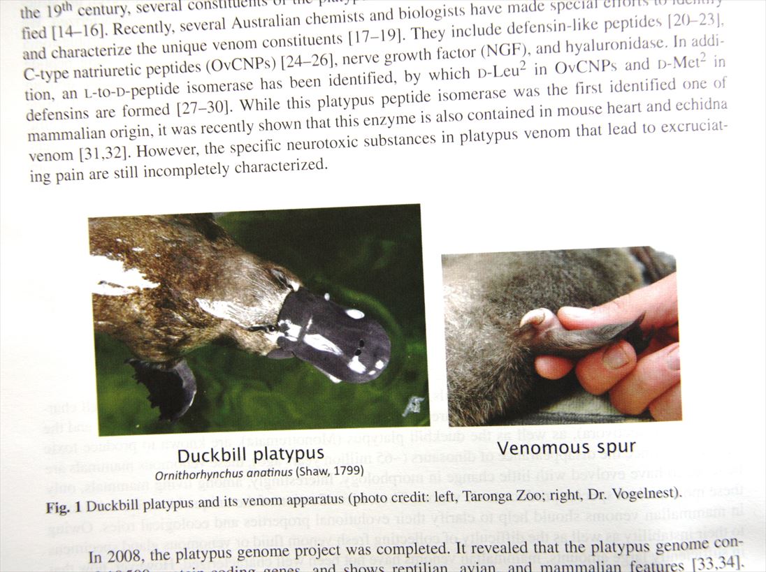 He then proceeded to investigate the platypus, another primitive mammal belonging to the monotreme group. The platypus is a rare mammal that occurs only in certain parts of Australia, and the spur found on the male's hind limb secretes venom. With cooperation from Sydney's Taronga Zoo, Prof. Kita collected platypus venom, discovered and elucidated the composition of 11 varieties of small bioactive compounds called peptides and demonstrated their unique properties. The results of his research were covered by the New York Times.
