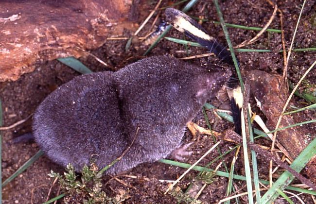 Northern short-tailed shrew (length 7 cm) eating a grasshopper