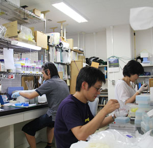 After the influenza virus binds to the host cell membrane and enters the cell, it sheds its protein shell and releases its genetic material, which then makes its way into the host cell nucleus. In order for the virus to replicate, it must make copies of its genome while also producing the protein shell that will carry the genetic material. The influenza virus performs these two processes by manipulating the genes that the cell uses for its own replication. In other words, the virus hijacks the cell's genes. Prof. Kawaguchi has been investigating which genes the virus takes over and manipulates, and how the virus carries out its manipulation. Using techniques to reproduce the viral genome replication process in a test tube, some of the cell genes needed for viral replication have been discovered, and the ingenious strategies used by the virus are gradually being clarified. Research is also closing in on the mechanism by which the synthesized viral coat and replicated viral genome are transported to the host cell membrane, where they combine to form a virus and detach (bud). Elucidating this series of processes will also make it possible to develop completely new types of drugs to combat the influenza virus.