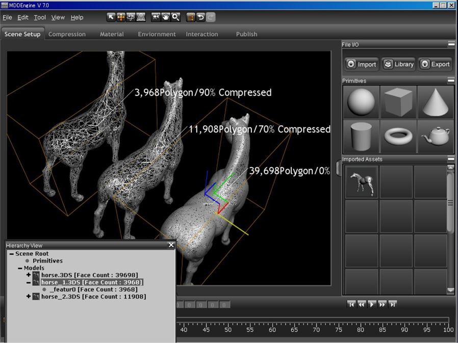 Three-dimensional CG data is actually an aggregation of small triangles known as polygons. Polygons of different shapes and sizes are combined to create stereoscopic images. The effects of light and wind are calculated by physical simulation, while everything else is expressed in polygon units. The more detailed the polygons, the more precise the images are, and the longer the calculations take. Prof. Kim has developed MDD Creator, a piece of polygon reduction software which creates a database of polygon models. The software does not trim all polygons equally, rather it determines which polygons may be deleted, depending on the conditions. In certain cases, over 90% of polygons may be omitted with only a minimal effect on the visual image.