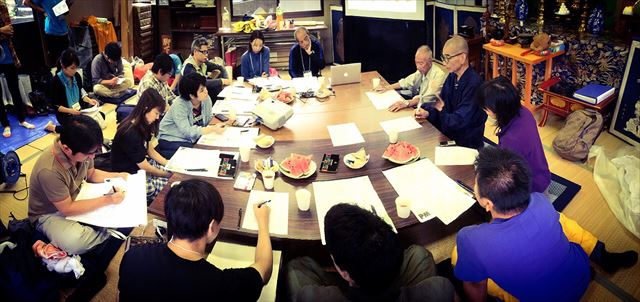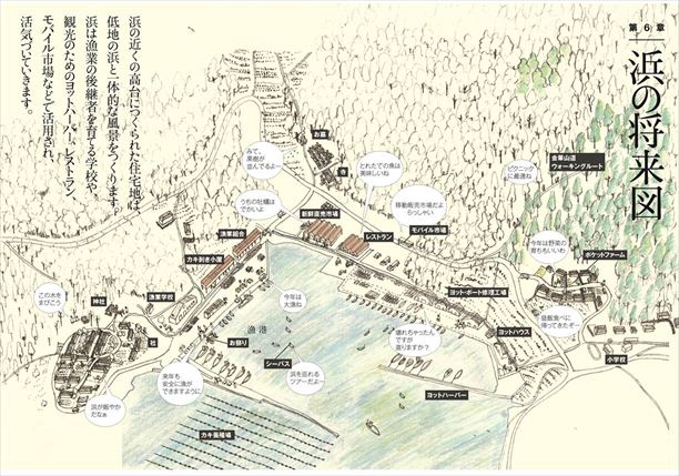Prof. Kaijima's department started out by interviewing residents to see what kind of support they hoped for. They learned that different hamlets and villages had different traits and lifestyles, even though they were all on the Oshika Peninsula. This went as far as differing styles of fishing. So even were a uniform plan to be proposed, it could not be implemented successfully. They realized that the key to recovery depended entirely on the will and desire of the residents themselves. Prof. Kaijima had residents create a local council which she would join to provide an outsider's perspective as a system of support. This mode of operation fulfills the role of being "both outsider and insider" as described by Fukushima University Professor Takaki Abe. Proposals included core houses for the communities and the establishment of fishing industry schools to train people to fish and to attract new residents. Another proposal turned attention to the mountains and restoring the disused mountain roads of the island of Kinkasan for use as hiking trails for visitors. This proposal would lead to the restoration of the timber industry and help keep the forest healthy to provide nutrients to the sea. Such ideas and others from the residents' councils were made visible through drawings presented at subsequent meetings to further expand those ideas. The fishermen, whose character has been shaped by years of dealing with the harsh forces of nature, sometimes expressed themselves with equal such force to the participating students, which led to the students' personal growth, as well.