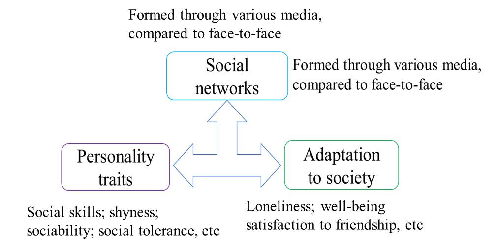 Conceptual diagram of the relationship details that Prof. Ye is focusing on in her researchAlthough new communication devices make it easier to transmit information, this also opens up the higher possibility of becoming dependent on such devices. According to Prof. Ye's research, "shy but sociable" people have a greater tendency to depend on smartphones. "Shy but sociable" refers to individuals who have a strong motivation to be with others, while also realizing that they are fearful and inhibited about mixing socially. These individuals find it easy to immerse themselves in social media that allows them to connect with large numbers of people without face-to-face interactions, and they cannot help but engage in constant online interactions so that they can maintain the feeling of having many friends. For those with a serious dependence, they even send online messages to people who are standing right in front of them. While no effective countermeasures have been found yet, it is evident that for future digital native generations, education from an early age about how to use communication devices is indispensable.