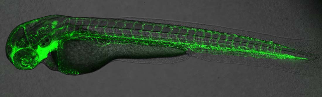 An adult male zebrafish (top) and an embryo (blood vessels illuminated using green fluorescence protein).