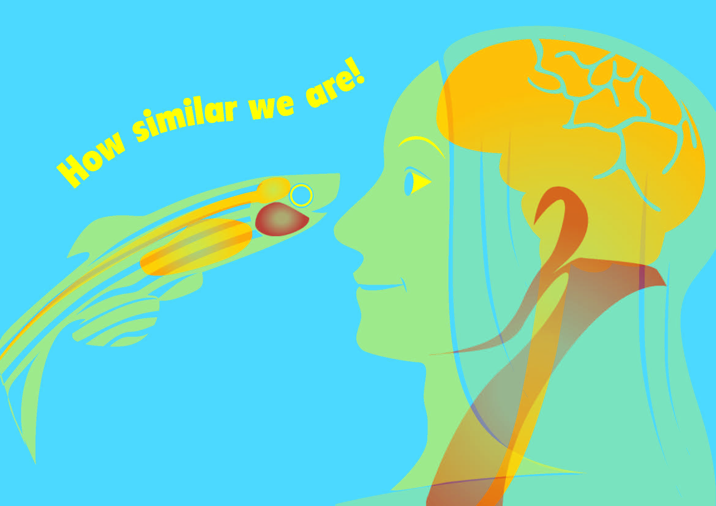 Science illustration lessons are offered in collaboration with Professor Sayoko Tanaka from the School of Art and Design. This piece explains the importance of zebrafish as a model animal. By 4th-year art student Mayu Soda (2012)
