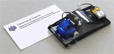 The key to producing agile movements is flexibility. One thing Prof. Mochiyama has noticed is the elastic deformation phenomenon known as 'snap-through buckling.' This unfamiliar term refers to the phenomenon of a metal or plastic rod or plate suddenly changing shape when force is applied to it. If you slowly apply force to one end of a long and thin piece of metal which is bent in advance, it may drastically change its shape to another completely different one. This quick deformation is due to its flexibility, and this is the source of the action of jumping. As this force can be applied and removed repeatedly, if you combine the piece of metal with a motor and attach them to a card-sized casing, you will have created a jumping robot which weighs as little as 14 grams. The robot starts to jump around as soon as the motor is switched on. Adjust the angle of the 'foot' (the piece of metal), and the robot will move forwards while it is jumping, even managing stairs. It moves in the same way as a frog and is the first ever robot able to jump in this way. Further adaptations can make it move in a zig-zag pattern, turn, swim in water, and perform a range of movements similar to those of small animals. Simple yet un-robot-like mechanisms allow for more and more variation.